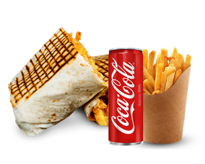 Wrap, 1 viande au choix. Servi avec boisson + frite