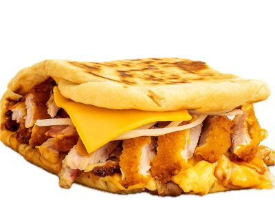 Cheese naan garni de salade, tomates, oignons et de poulet...