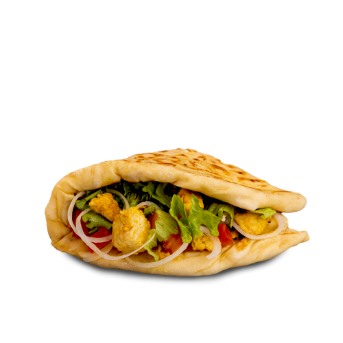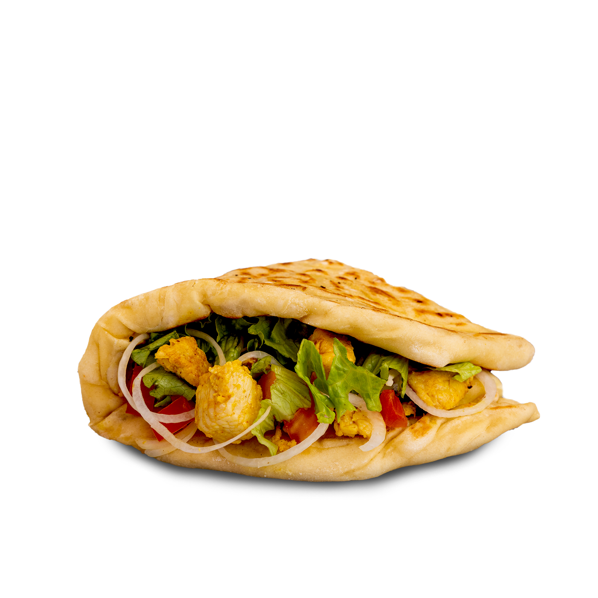 Cheese naan garni de salade, tomates, oignons et de poulet au curry.
