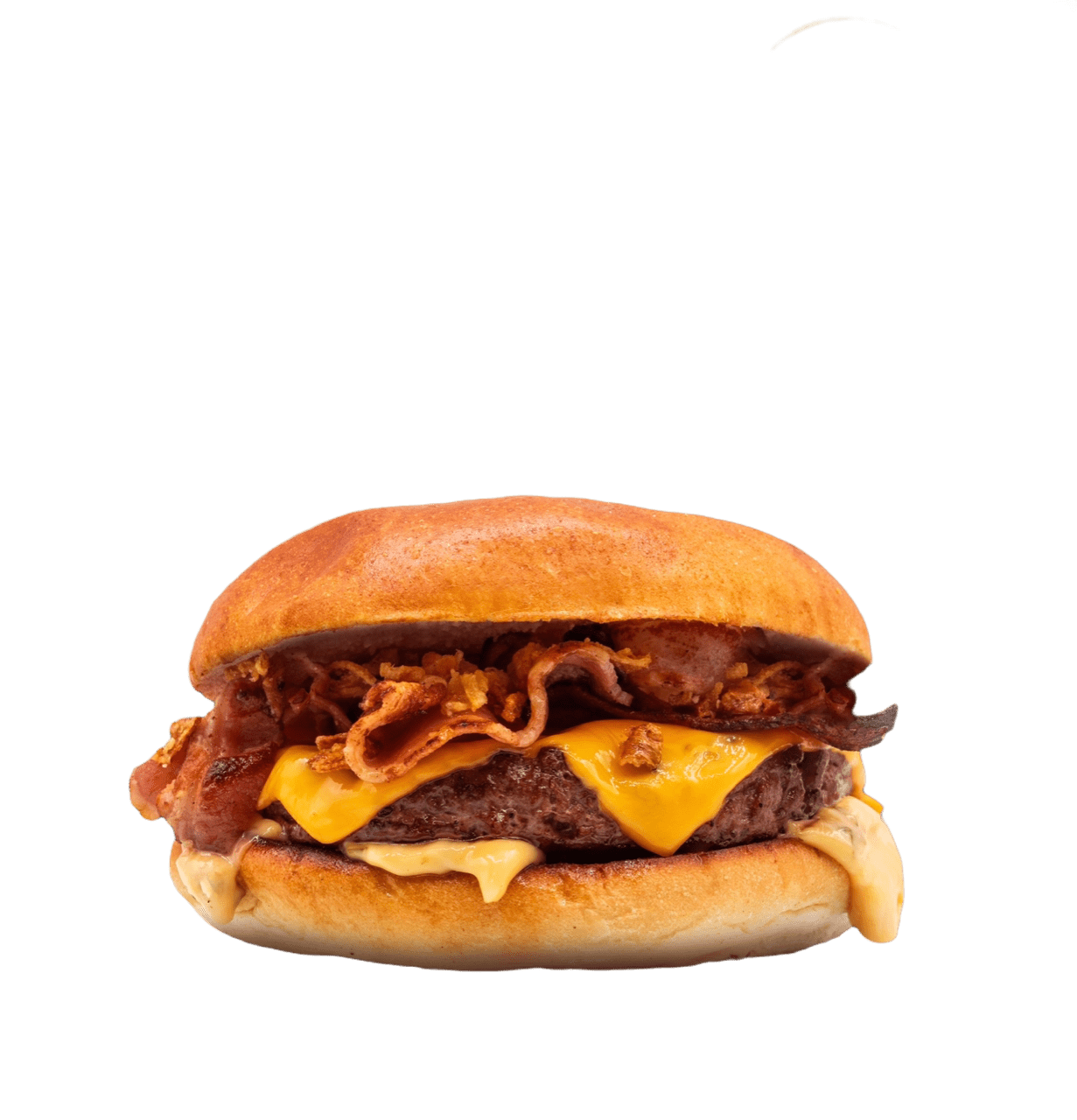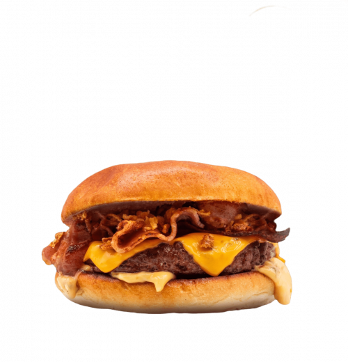 Pain bun, steack haché façon bouchère, oignons frits, triple cheddar, triple bacon