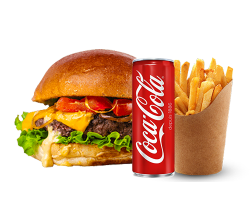 Salade, Tomates, Oignons fondu, Cheddar, Steak Haché façon bouchère. Servi avec boisson + frite