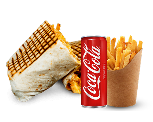 Wrap, 1 viande au choix. Servi avec boisson + frite
