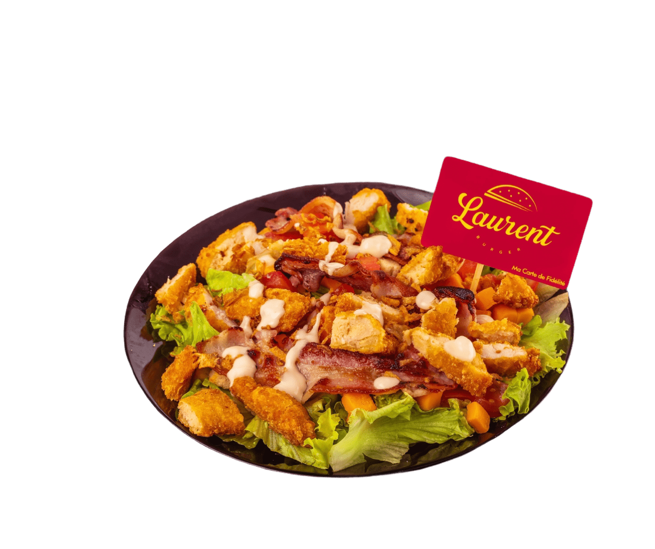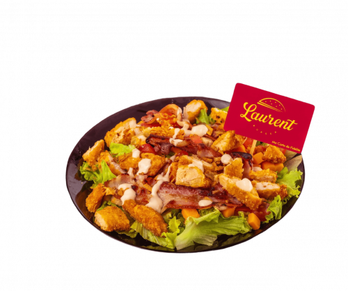 Salade, tomates, oignons, poulet, mimolette, bacon, crouton